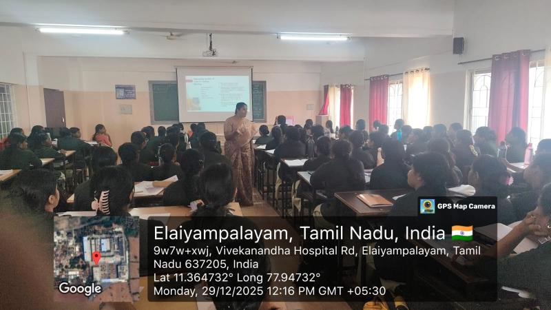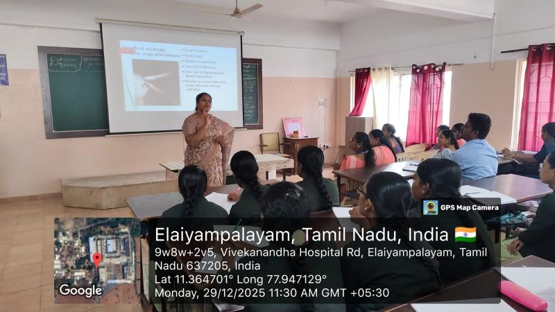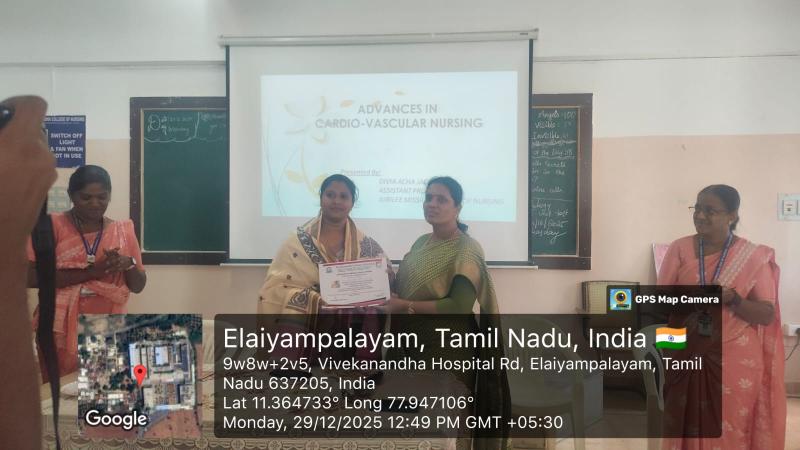 The guest lecture on “ADVANCES IN CARDIOVASCULAR NURSING” was successfully conducted on 29.12.2025 for students of Vivekananda College of Nursing, Elayampalayam. The programme was organized by the Department of Medical Surgical Nursing. A total of 100 II Year B.Sc. Nursing students and all the faculty members of Vivekananda College of Nursing participated in the programme. The resource person for the session was Mrs. Divya Acha Jacob, M.Sc. (N), Professor, Department of Medical Surgical Nursing, Jubilee Mission College of Nursing, Nagarbhavi, Bangalore.