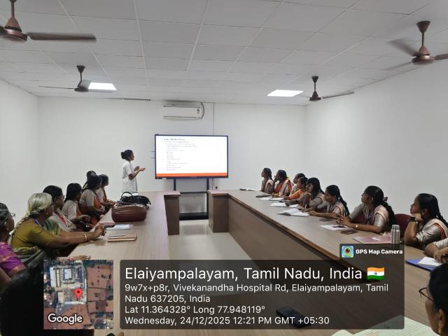 The Journal Club presentation on the topic “Green Nursing Practices” was successfully conducted by the Department of Nursing Foundation on 22.11.2025 at the Seminar Hall, Vivekanandha College of Nursing, Elayampalayam. The presentation was delivered by Ms.Shakila Dharshini R, B.Sc (N), Nursing Tutor, and was attended by VCN faculty members and M.Sc Nursing students. All faculty and M.Sc (N) students gained practical knowledge and insights on implementing green nursing practices in clinical and community settings.