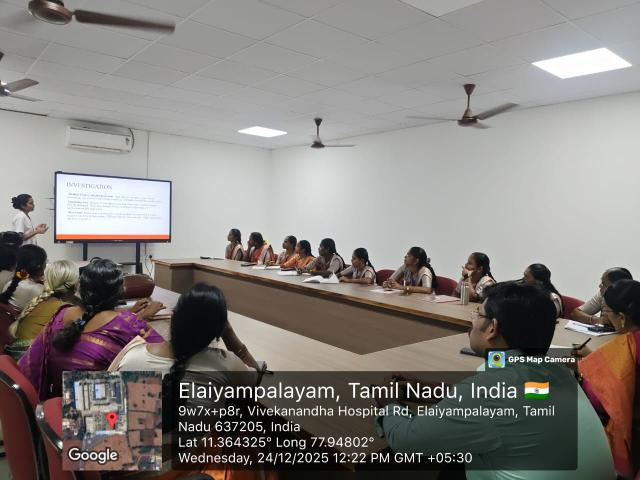 The Journal Club presentation on the topic “TAKAYASU ARTERITIS” was successfully conducted by the Department of Medical Surgical Nursing 24.12.2025 at the Seminar Hall, Vivekanandha College of Nursing, Elayampalayam. The presentation was delivered by Ms. Karthika.K, B.Sc (N), Nursing Tutor, and was attended by VCN faculty members and M.Sc Nursing students.