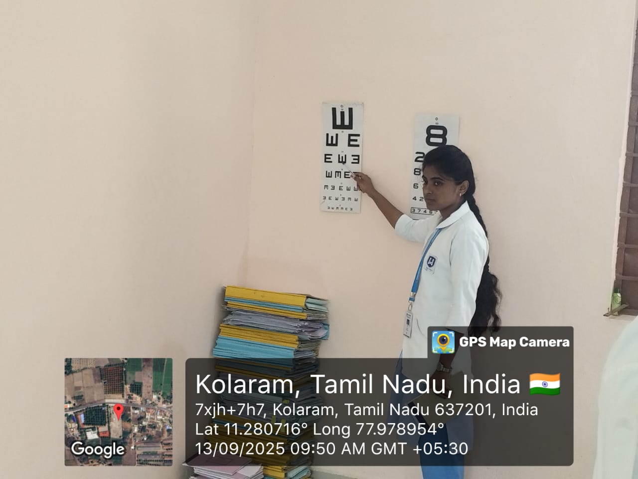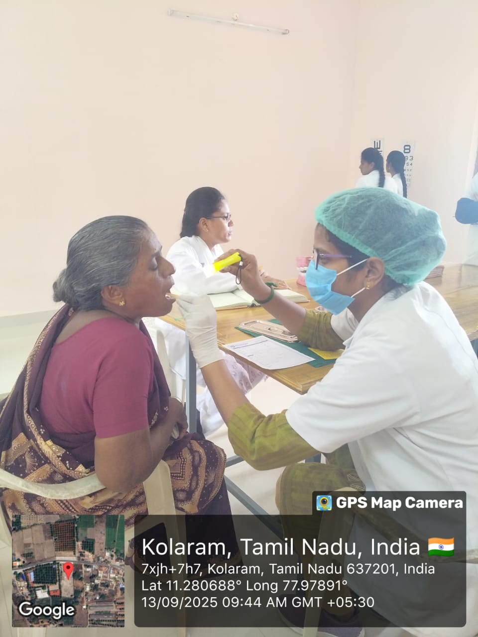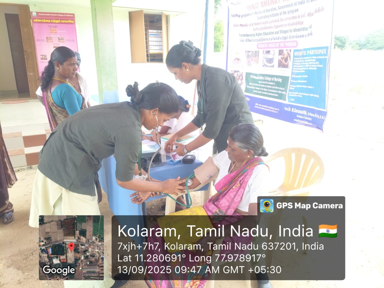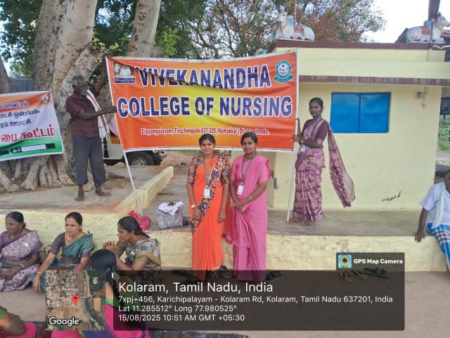 Vivekanandha College of Nursing adjoined with Vivekanandha Medical care hospital and organized an eye camp at Kolaram panchayat office on 13.09.2025 .The camp was organized by Dr. M. Sumathi,M.Sc(N), Ph.D(N),Principal, Vivekanandha college of Nursing along with Mrs.A.Lalitha HOD (Community Health Nursing Department) and Faculties of Community Health Nursing Department [Mrs.M.Sindhumathi M.Sc.(N), Ms.A.Nivetha.B.Sc.(N), Mrs.V.Sukitha B.Sc(N), Ms.B.Abarna B.Sc(N)] and III year B.Sc Nursing VI-Sem students were participated in the camp. The camp aimed to provide free eye care services to the community, promote eye health awareness, detect vision problems.